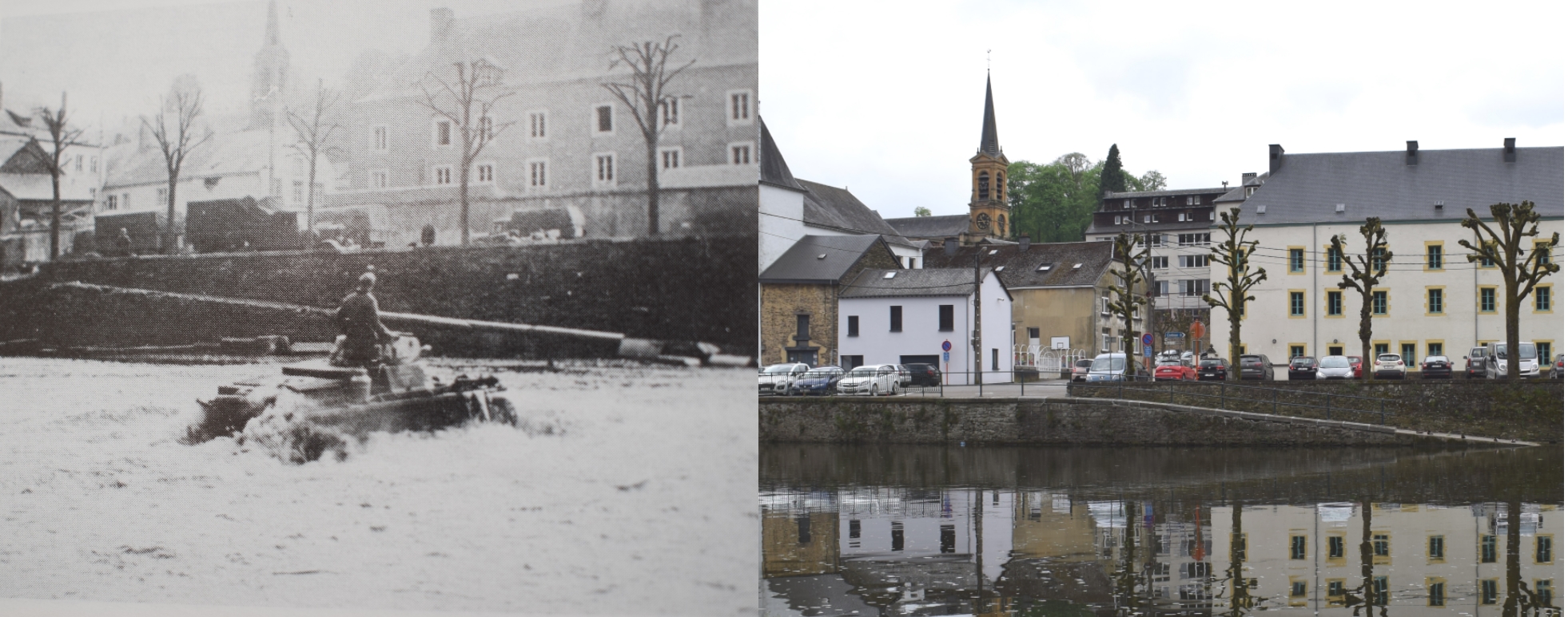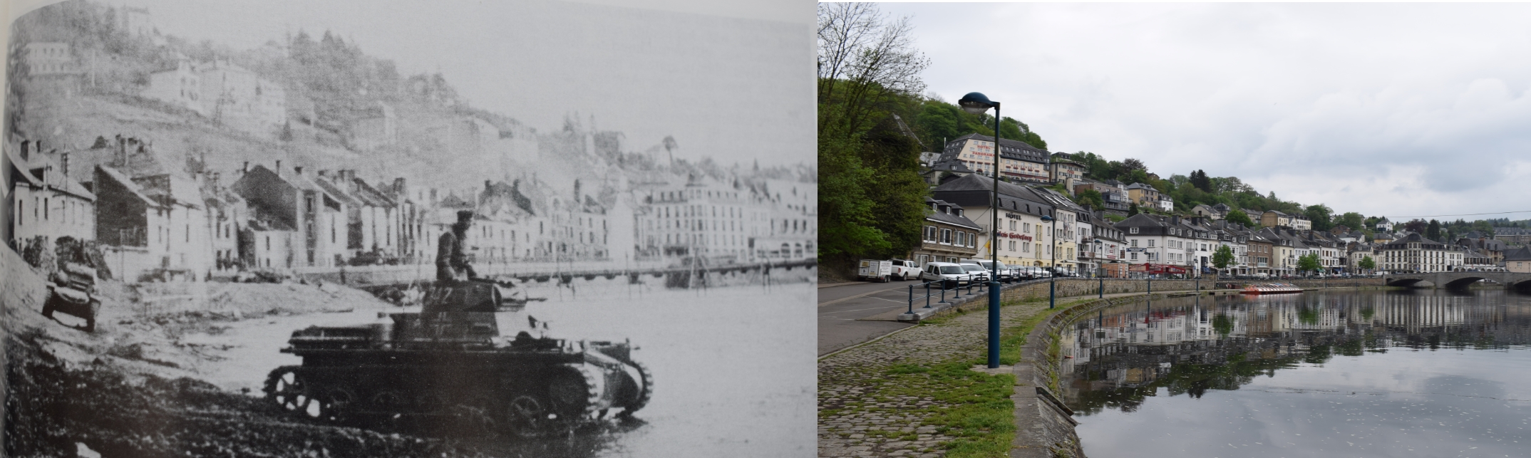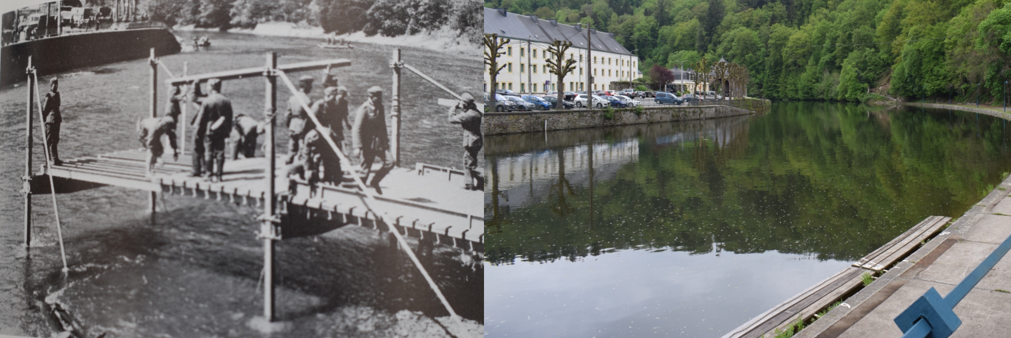 The photos show a comparison with Guderian’s visit, note the handrails have not changed! Engineers building a replacement bridge and tanks of the 1st Panzer Regiment fording the river Semois.