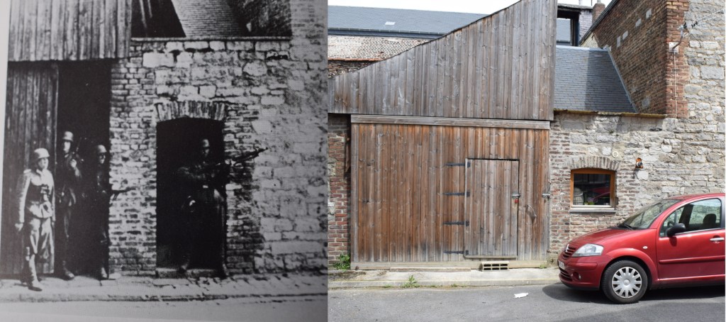 The then and now comparison shows Leutnant Walter Heinrich, far left with pistol in hand from Pionier Battalion 45 and his men during the fighting in the eastern part of the town. The additional photos show the views to the right and behind the photographer.