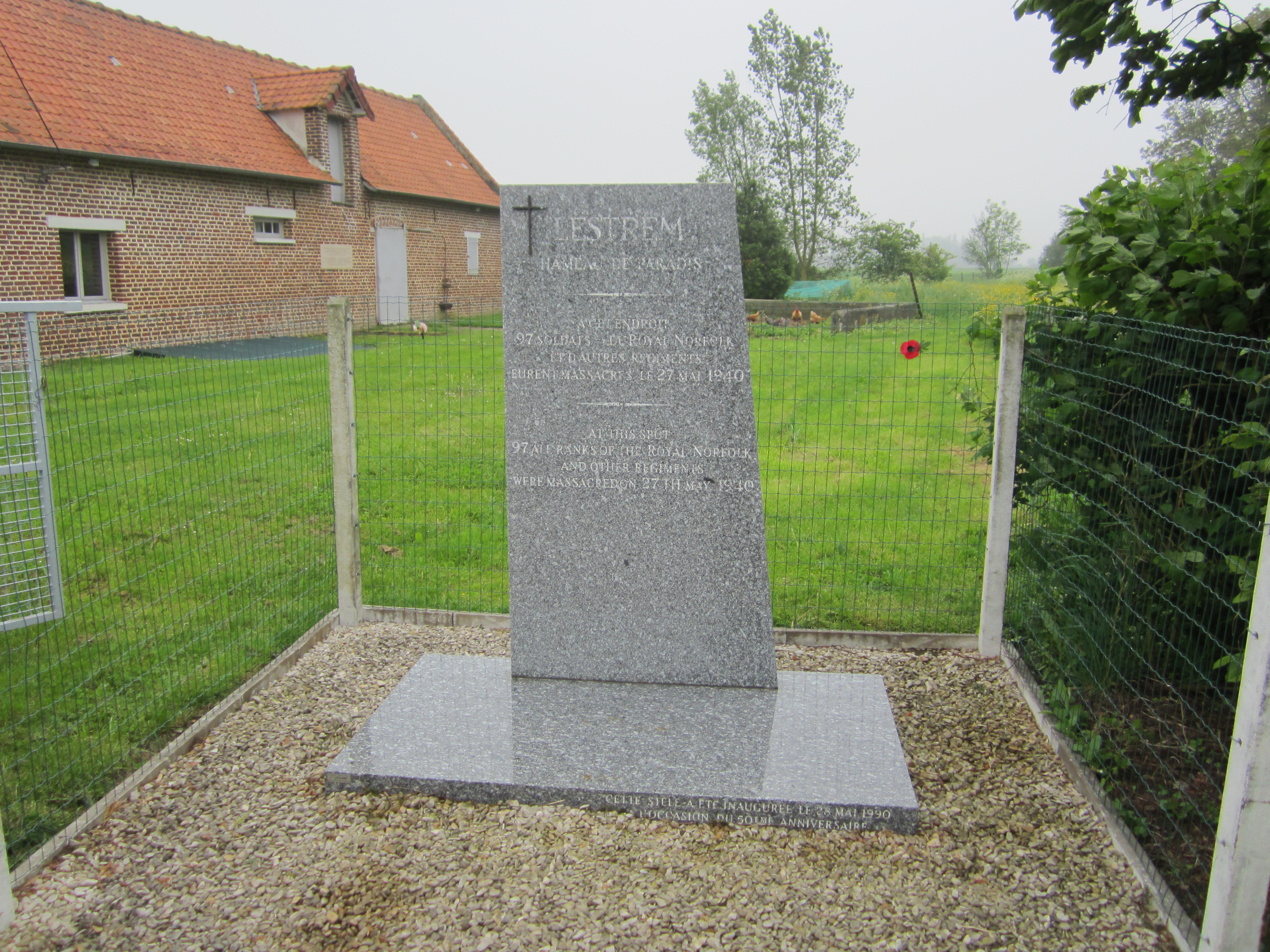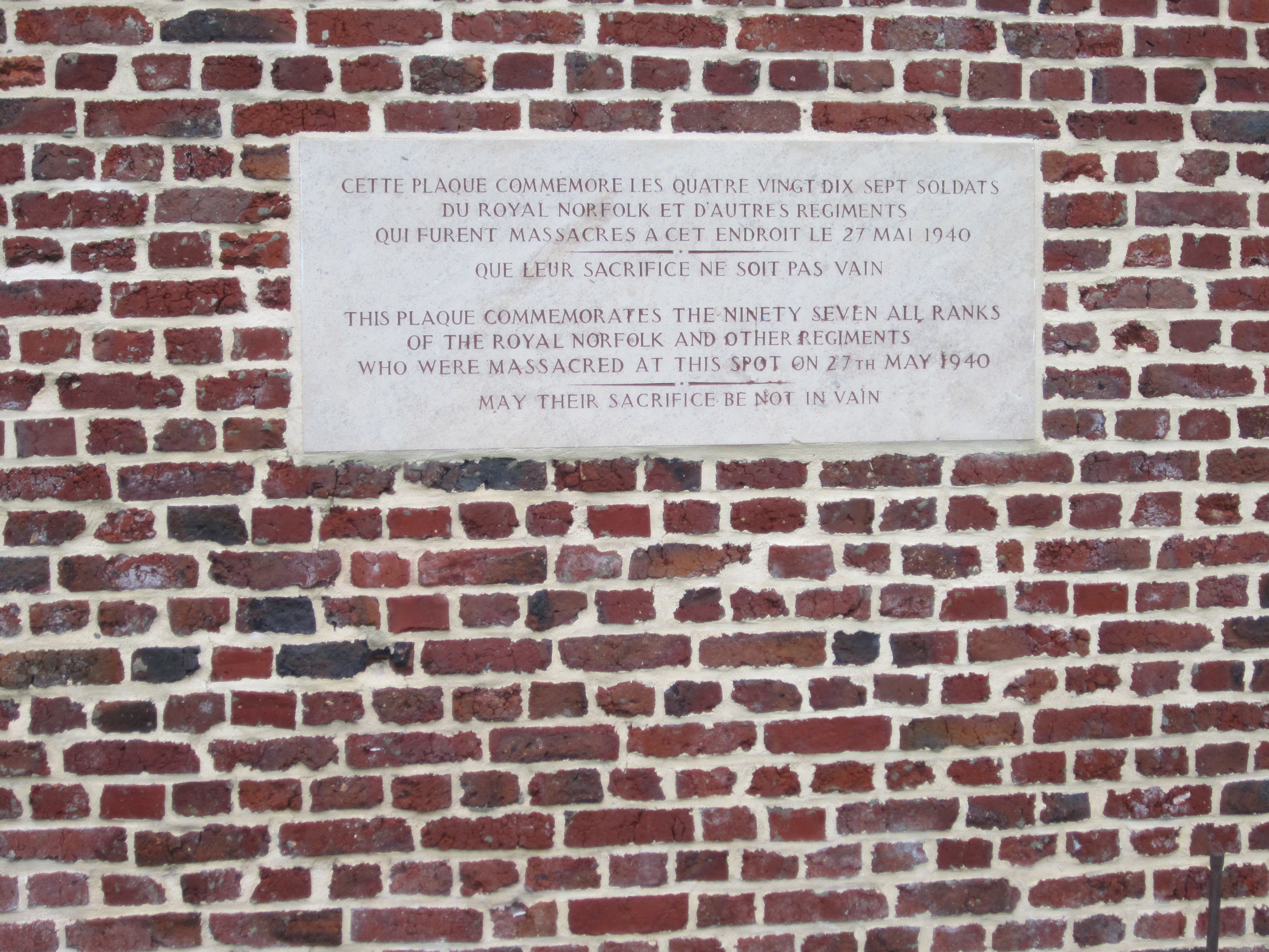 Around the plaque on the barn wall it is still possible to make out where the bullets struck. The remainder of the photos show two monuments to the events that took place here, one at the church and the other in front of the barn. The final photo shows the CWCG at Le Paradis where the Norfolks now rest.